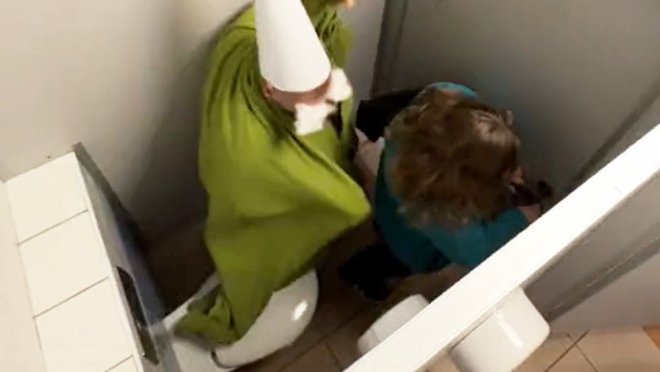 Na najnowszym nagraniu widać, jak mężczyzna w zielonej pelerynie wbiega do damskiej łazienki. Tuż za nim do pomieszczenia wbiega goniący go pracownik ochrony. Uciekając, Crawly wspina się, a następnie wchodzi górą do jednej z kabin. W tej znajduje się przerażona kobieta, która tuż po tym, jak mężczyzna wskakuje do środka, wybiega na zewnątrz, ukrywając się za pracownikiem ochrony. Nagranie kończy się w momencie, kiedy Crawly wybiega z łazienki, a ochroniarz zakrywa ręką kamerę.
