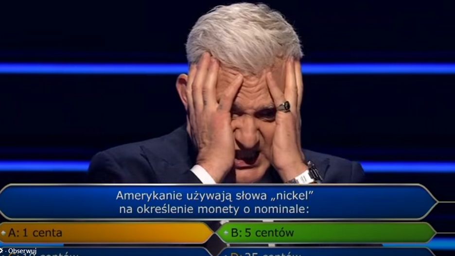 - Oto co myślę na ten temat: wydaje mi się, że "nickel" chyba ma już nic niższego. 25 to "quarter", 10 to chyba "dime". Ja bym obstawiał 1 centa, ale weź poprawkę, że to nie moje pieniądze i że ja tak naprawdę bardzo się przejmuję, a z drugiej strony właściwie więcej z siebie nie wykrzesam. To jest moja ostateczna odpowiedź - doradził prowadzący.